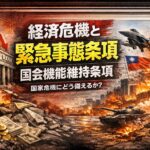 2026年2月15日 / 最終更新日時 : 2026年2月15日 info 国会機能維持条項 Episode-004:2経済危機と緊急条項の関係[国会機能維持条項] 経済危機と緊急条項の関係 結論から言うと――経済危機は、戦争や大災害ほど“緊急条項の直接トリガー”にはなりにくい。ただし、金融システム危機レベルになると議論は一気に加速します。 ① 経済危機は「非常事態」になるのか? 通 […]