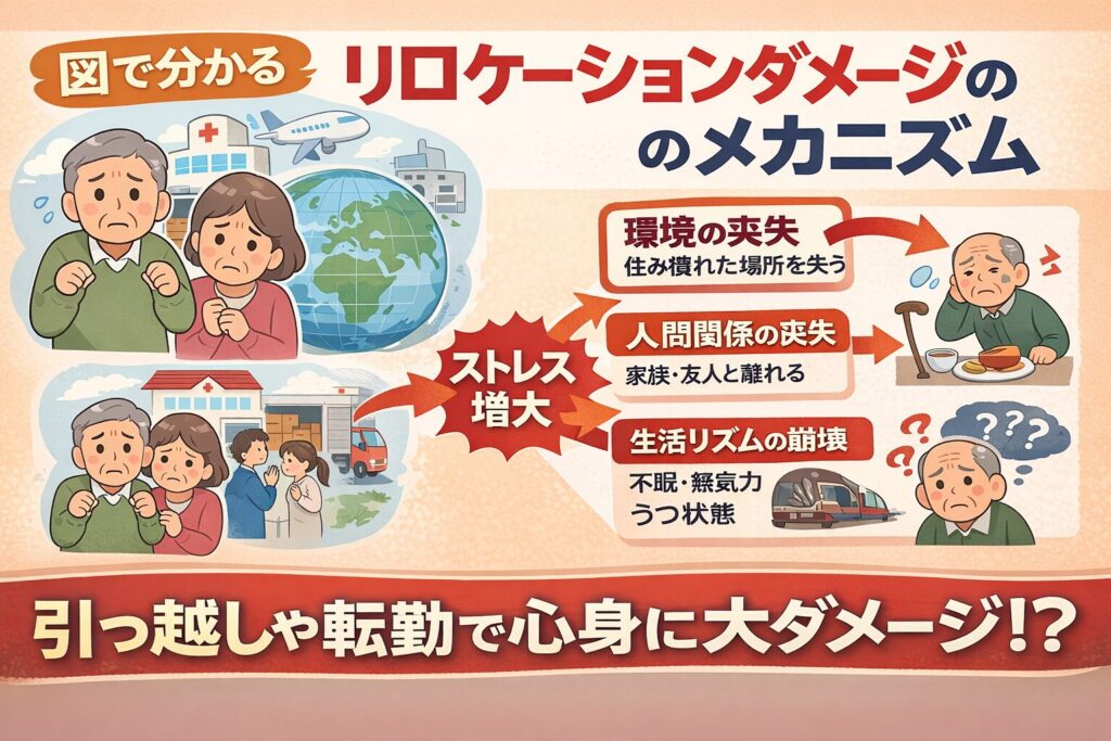 人や組織が“住む場所・生活環境・職場”などを急に移動させられたときに生じる身体的・心理的・社会的なダメージを指します。