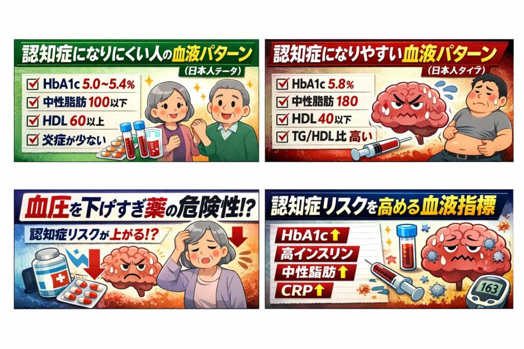 認知症と血圧はかなり強い関係があります。特に重要なのは「高血圧」と「低血圧の両方」です。